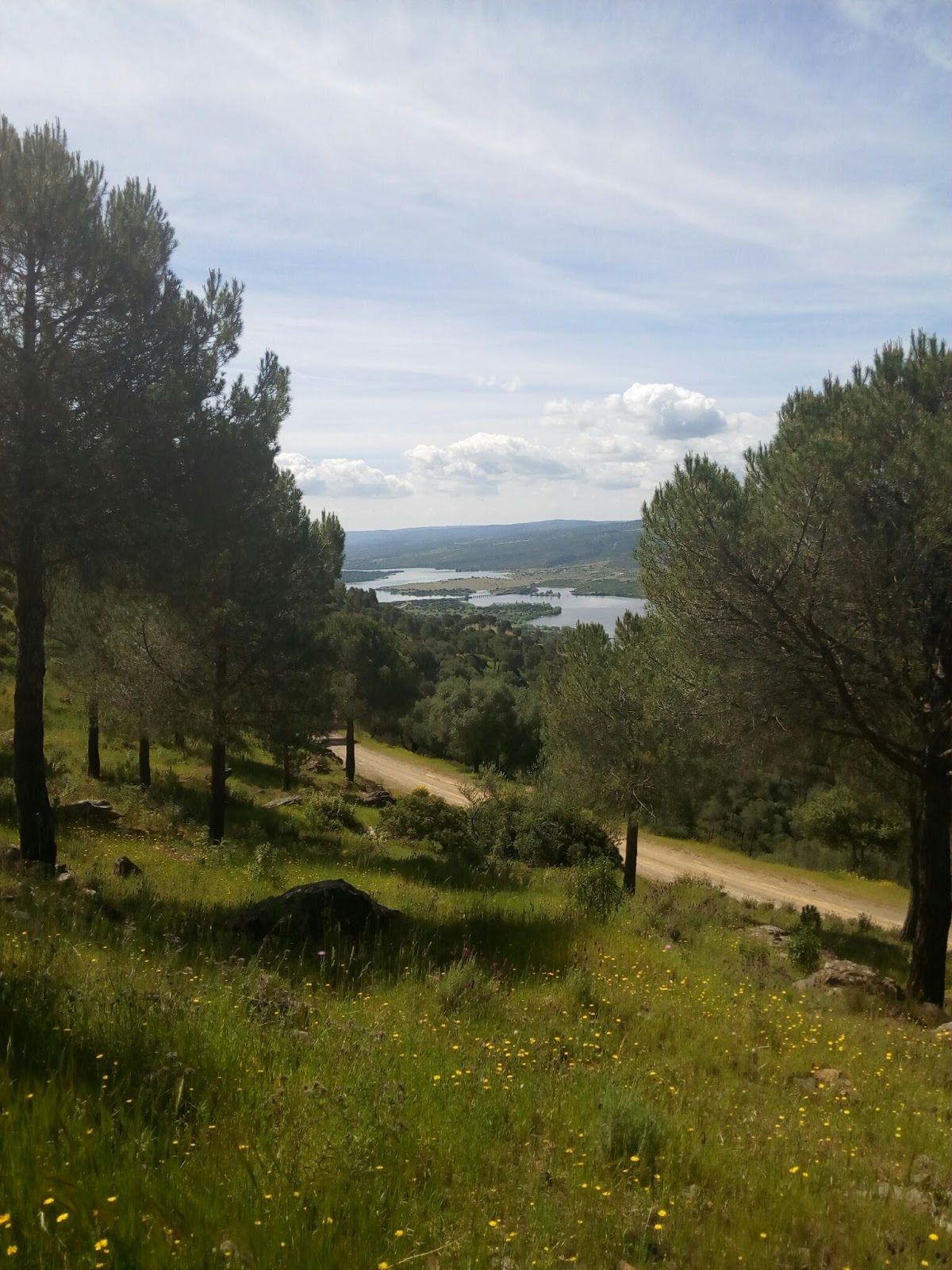 Pronto nos saluda el sol, entre fincas de vacuno y porcino. Esperamos que el día no acabe mal. Nuestras caras son ya reflejo del peso de nuestra espalda y aún no vemos el valle del Viar. Queda poco y a lo lejos aparece... Inmenso, bello y al alba. Es un sitio protegido con la màxima categoría. Reserva Natural. Valle amplio al fondo Melonares, pantano que abastece a Sevilla y en plena Rivera del Viar. Es el primer pantano europeo que su presupuesto para compensar el impacto ecológico supera al de su construcción.